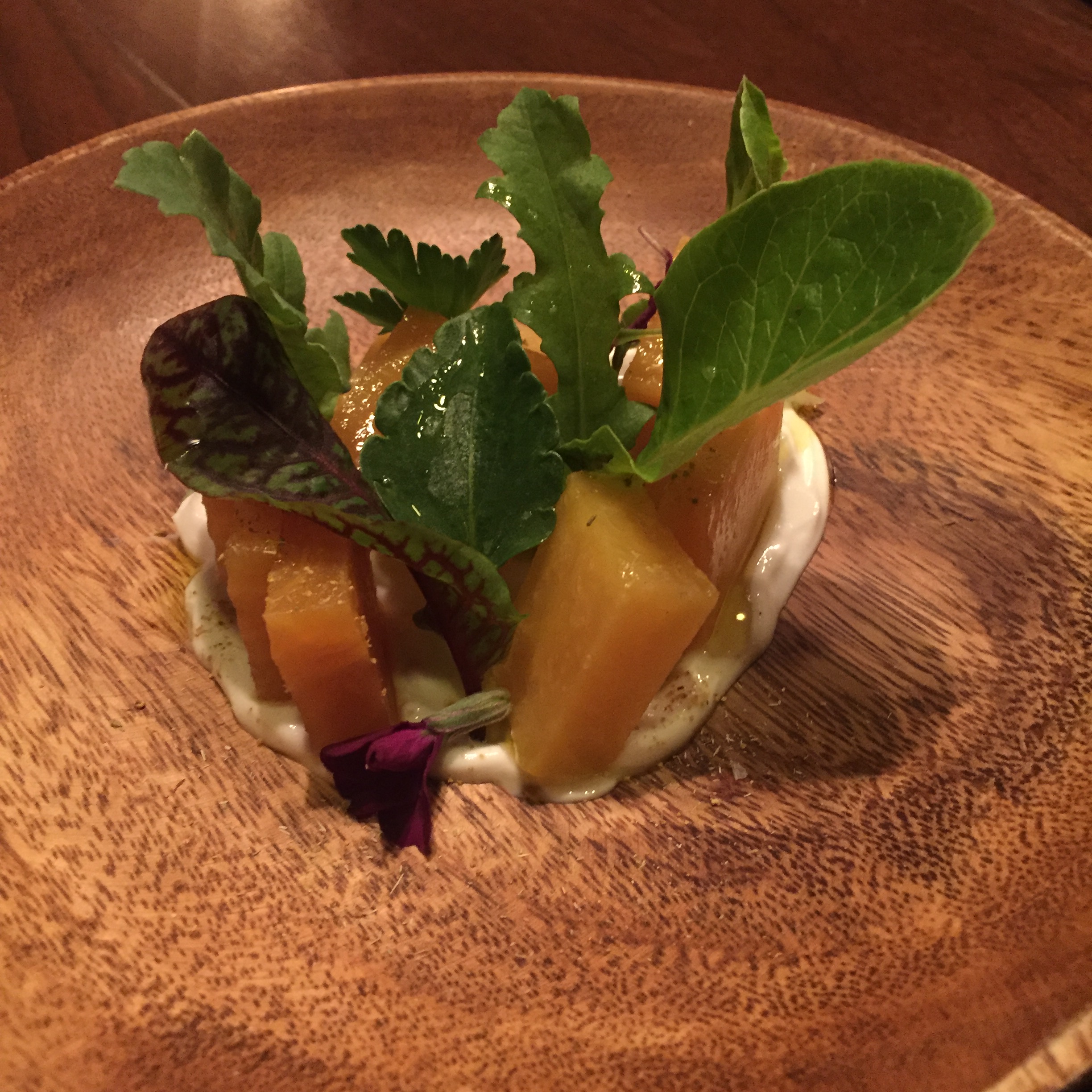 Excellent service, and minimilist design elements abound. The restaurant was larger than I imagined, but this seems to make reservations possible. As was the case with ours, being that we only booked a couple weeks out. For Valentine’s day. With the ease of getting reservations, compared to the full fledged Uchi, these guys are making procrastination work in our favor. Roasted Golden Beets – Bright and tangy is the thought here. The underlying Icelandic yogurt/cheese, Skyr, drives home the point. Brussels Sprouts – Very rich and tangy. The fish caramel, lemon & chili are the perfect flavor combination. You could almost make a meal from this appetizer alone. Japanese Hot River Rock – Sear your own Waygu beef morsels to your liking. There’s kind of a dry-fondue feel to the process. Delightful. Tobacco Cream – Under two chocolate mousse-filled shells, with show-stealing, balls of actual butterscotch- smoky, peaty, real-scotch filled pearls. Unbelievable. Susuki Yaki – Grilled Mediterranean Sea Bass – Probably the best presentation of the lot, but maybe not the most earth-shatteringly delicious. It was solidly “good”. Waygu Beef – Searing on the Hot Rock. uchiko – impeccable design. Sweet Corn Sorbet – I’m not a huge fan of corn generally, but this sweet dessert was outstanding. It utilizes several corn derivitives, including a heavy “pulverized-popcorn” dusting. All of which make for a singular-taste powerhouse.